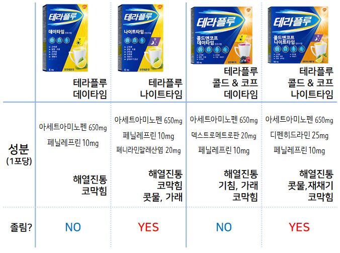 테라플루의 종류에 따라서 들어가있는 성분이 다르지만 모두 해열제와 코막힘을 베이스로한
