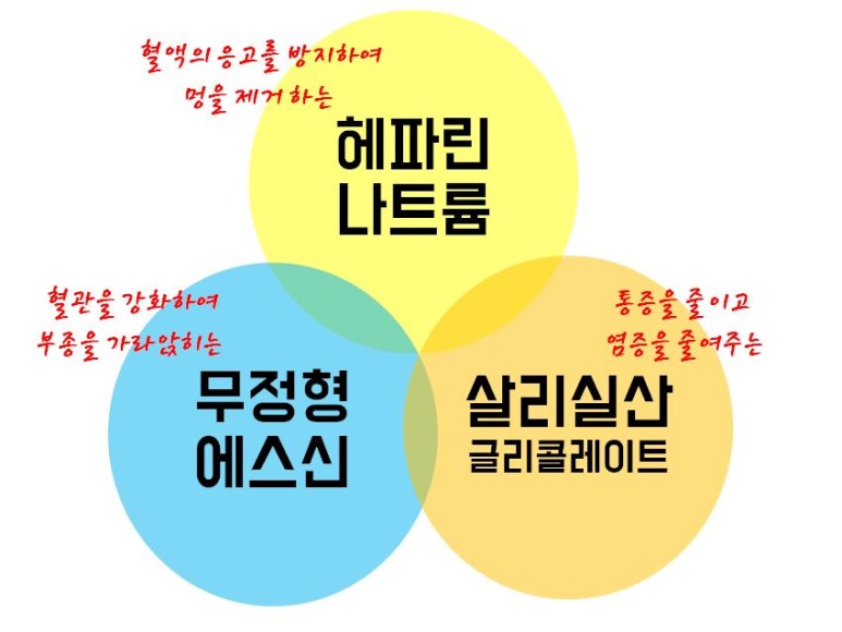 에스신 (1g 중 10mg) : 혈관을 튼튼하게 만들어 외부로 빠져나오는 세포액을 줄이고